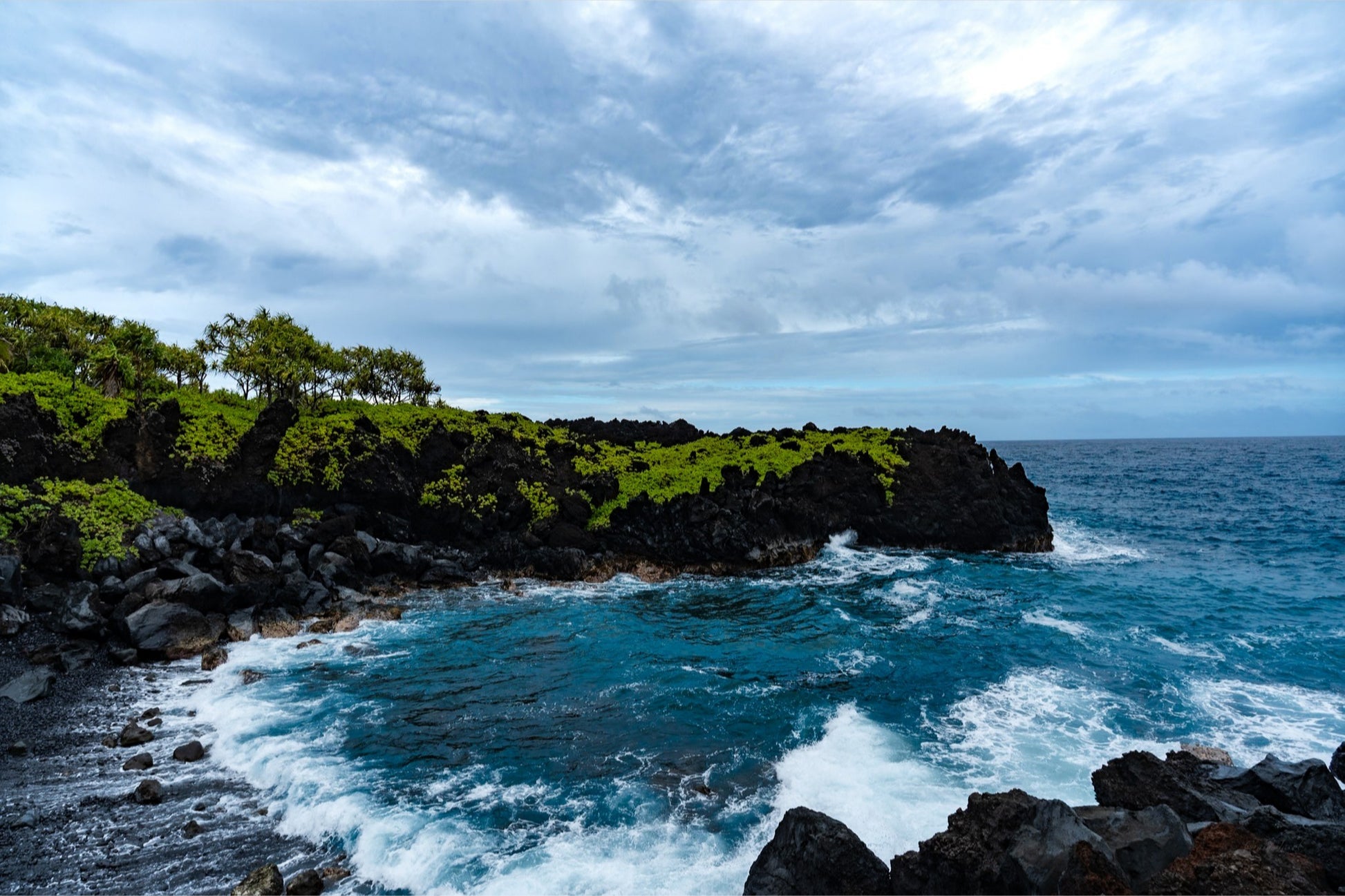 The Black Sand Beach at Waiʻānapanapa State Park, known as Paʻiloa Beach, was formed from lav.a flows of the Haleakalā volcano that cooled and shattered into fine particles upon meeting the ocean, creating its striking black sand. This beach is not only a geological marvel but also holds cultural significance, tied to a Hawaiian legend about a princess named Popoalaea who hid in a nearby lava cave to escape her jealous husband, only to be discovered and killed, with the cave’s red shrimp symbolizing her blood. Catured in April 2025.